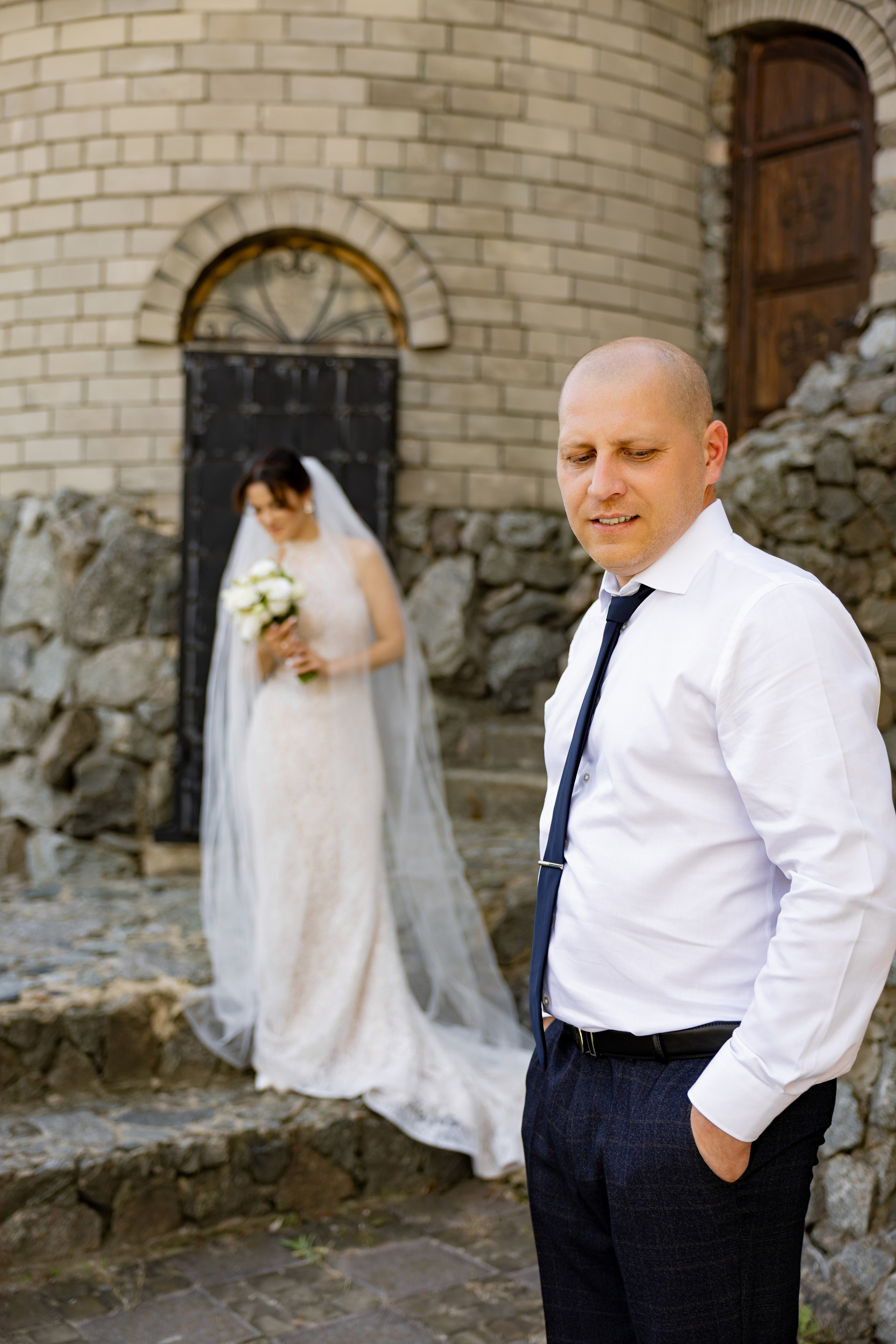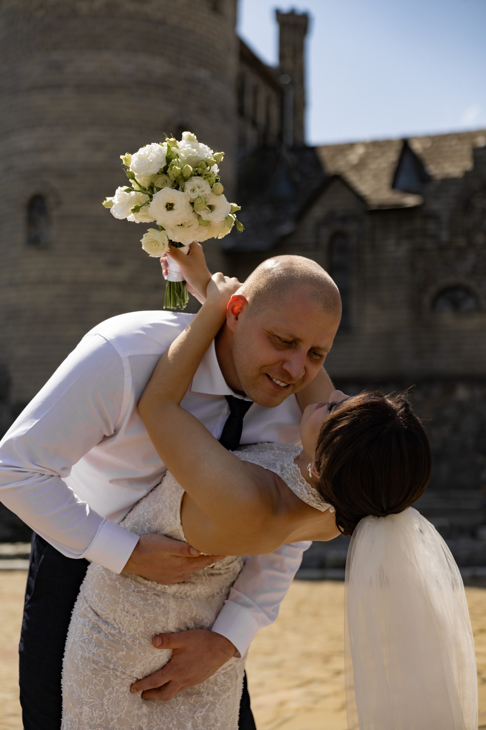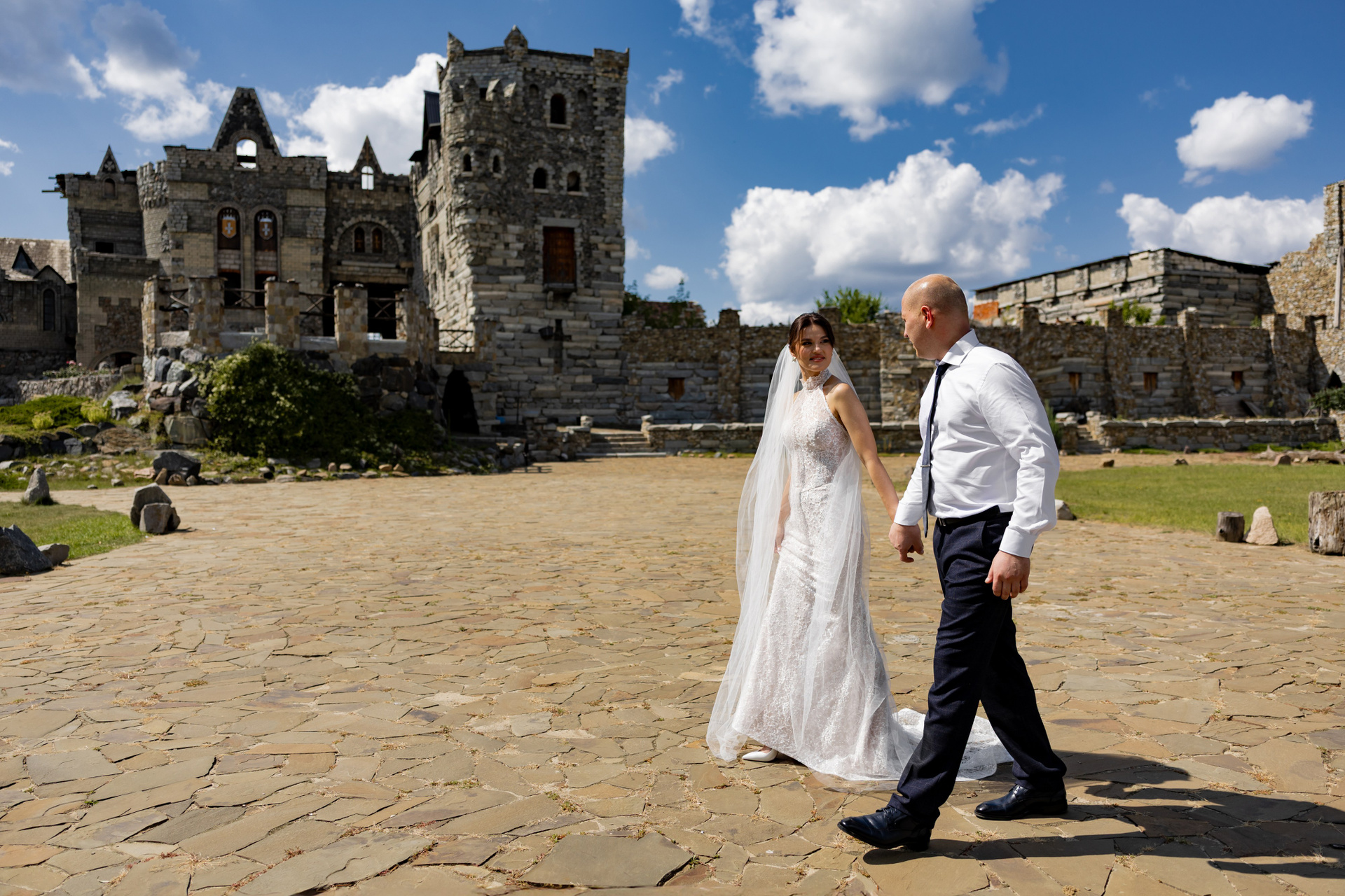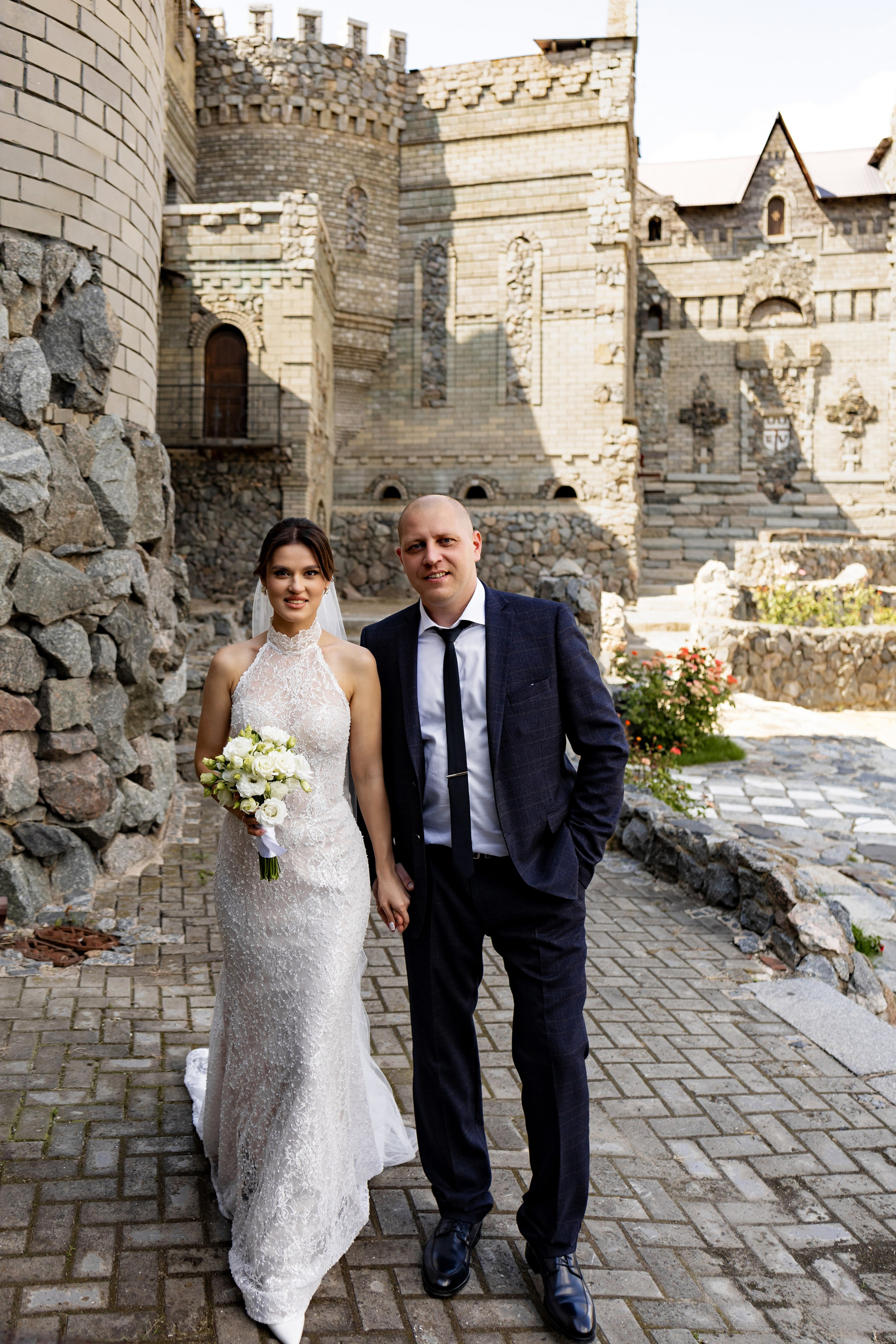 В тот день была особая обстановка… Такая, что почти весь Загс был закрыт. Бегом расписаться в маленьком кабинете. Выйти на улицу и снова идти под крышу. Фотаться с пришедшими на роспись гостями чисто символически и наспех. Поэтому, когда мы выехали на фотосессию в замок (а это на минуточку за городом), с великой радостью выпили шампанского и там уже все отлегло. Счастливые и довольные продолжили творить.